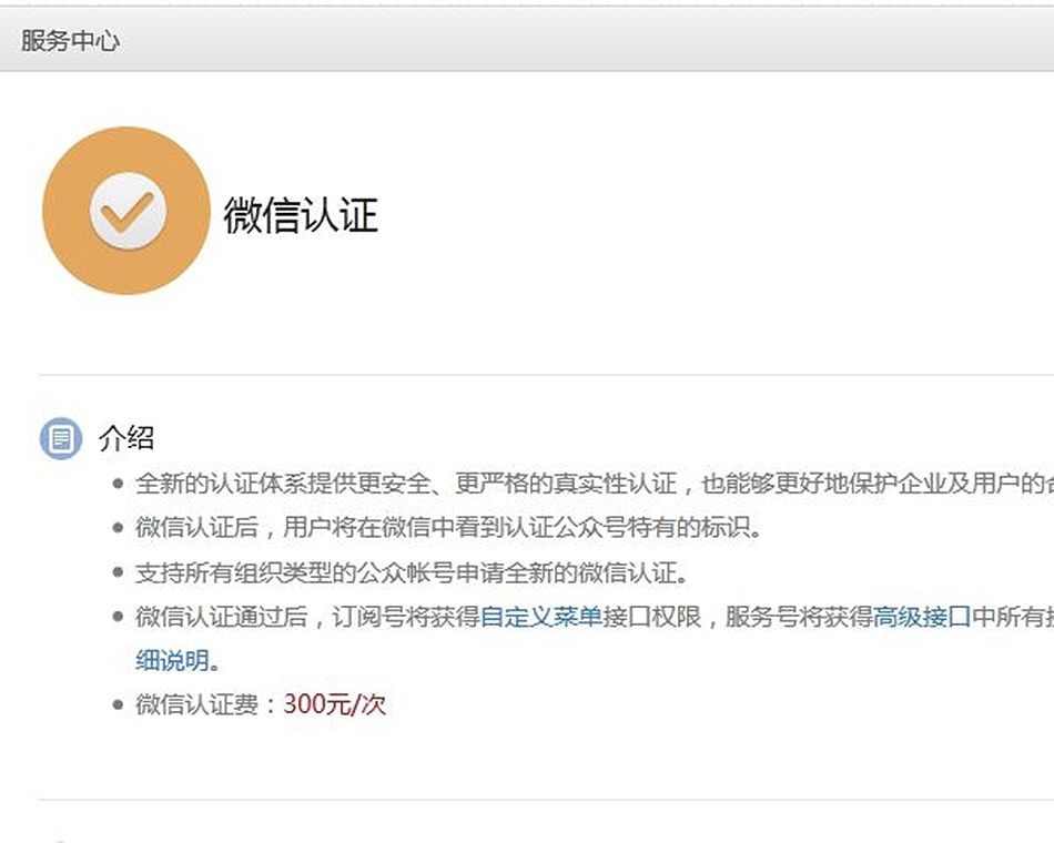 注:微信认证是针对非企业类型没有对公账户或对公帐号无法正常打款至我司收方帐号上的情况下可以选择的注册方式,需进行微信认证,服务审核费300元/年。