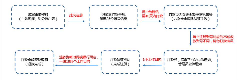 支付验证注册:注册信息提交完成后页面会显示应该打款的账户信息和随机金额(0.01-1元),请使用注册时填写的对公账户打款页面指定金额至我司指定的25位收款帐号,打款信息正确在1个工作日内验证成功并推送消息给您,汇款金额3个工作日内原路退回。