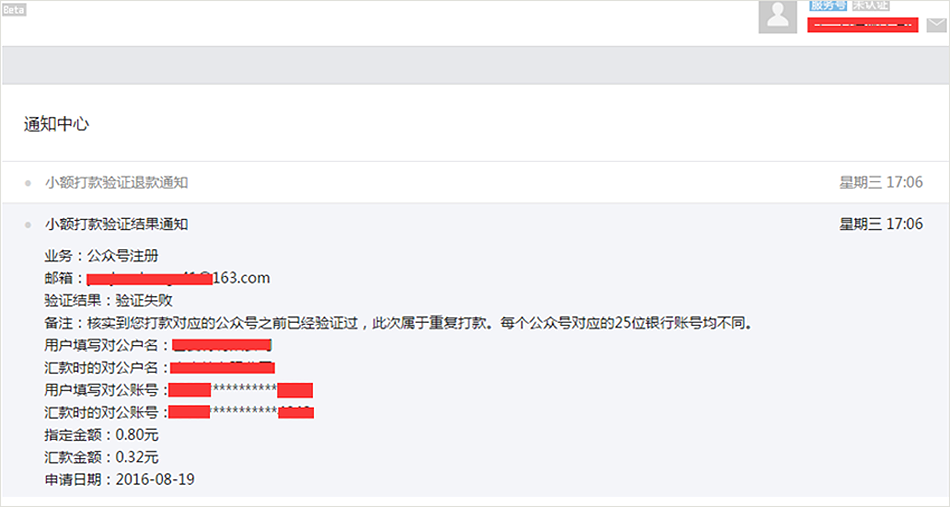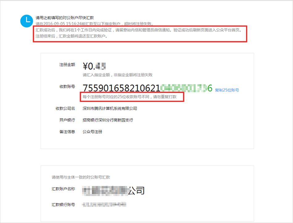 如果不是通过注册填写的对公帐号打款将会失败,页面会马上提示失败原因并重新提供注册信息。