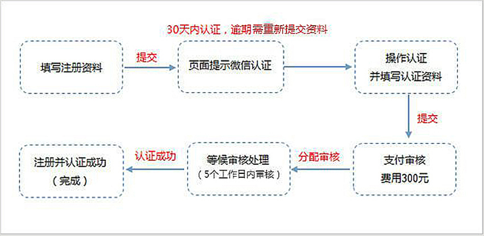 1、信息登记填写并提交后,30天(自然天)内必须完成微信认证,否则帐号将不能使用,,但可以重新提交资料。